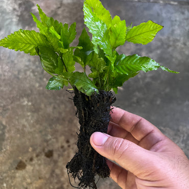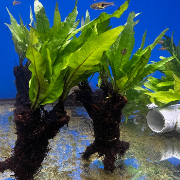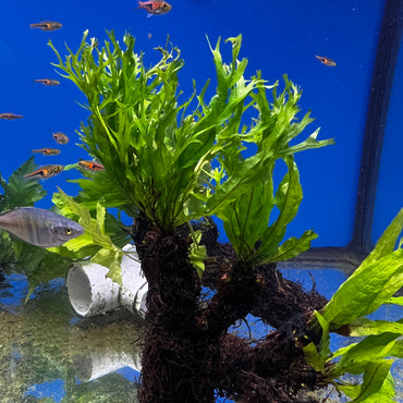 A variety of different ferns may be on your tree. Ranging from Bolbitis, Windelov, Java, and Trident Fern that will be attached on the bolbitis root tree.